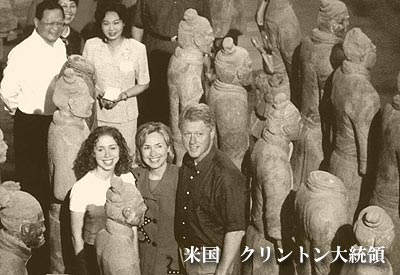 国家元首たちの思い: 世界文化遺産の中でも、秦始皇帝の兵馬俑ほど世界各国の元首・指導者たちが訪れた場所はありません。その最大の理由は、その規模の大きさとか、当時の文明が想像を超える先進性をもつという面もありますが、それらの理由とは別に、始皇帝があの広い中国を2000余年も前に統一したこと。法律をつくり、度量衡を制定し天下に広く実行させるという偉業を成し遂げた偉大な為政者であったという事実が、現代の世界各国の政治家たちをこの地に惹きつけるのだと思います。 兵馬俑建造の目的が、自らの墓を俑(陶製の人形)の兵士や軍馬の部隊で守らせようとしたことにあったとしても、これだけの規模、そして専門知識者・技術者を国中から無数ともいえるほど数多く集めた力。さらに紀元前の構築・製作物にもかかわらず、現代科学をもってしても解けぬ製作技術の先進性の謎など。 始皇帝が完全に国家を統一しだけでなく、いろいろな人智を集約させることの出来た稀代の為政者であったこと。またどのような方法でこんな大規模な専門技術者を集め、集団チームを編成したのか・・・・。なども現代の指導者を惹きつける大きな魅力に違いありません。 以下、兵馬俑を訪れた世界の国家元首・首脳などの主要人物を紹介しましょう。(来館年代順) |